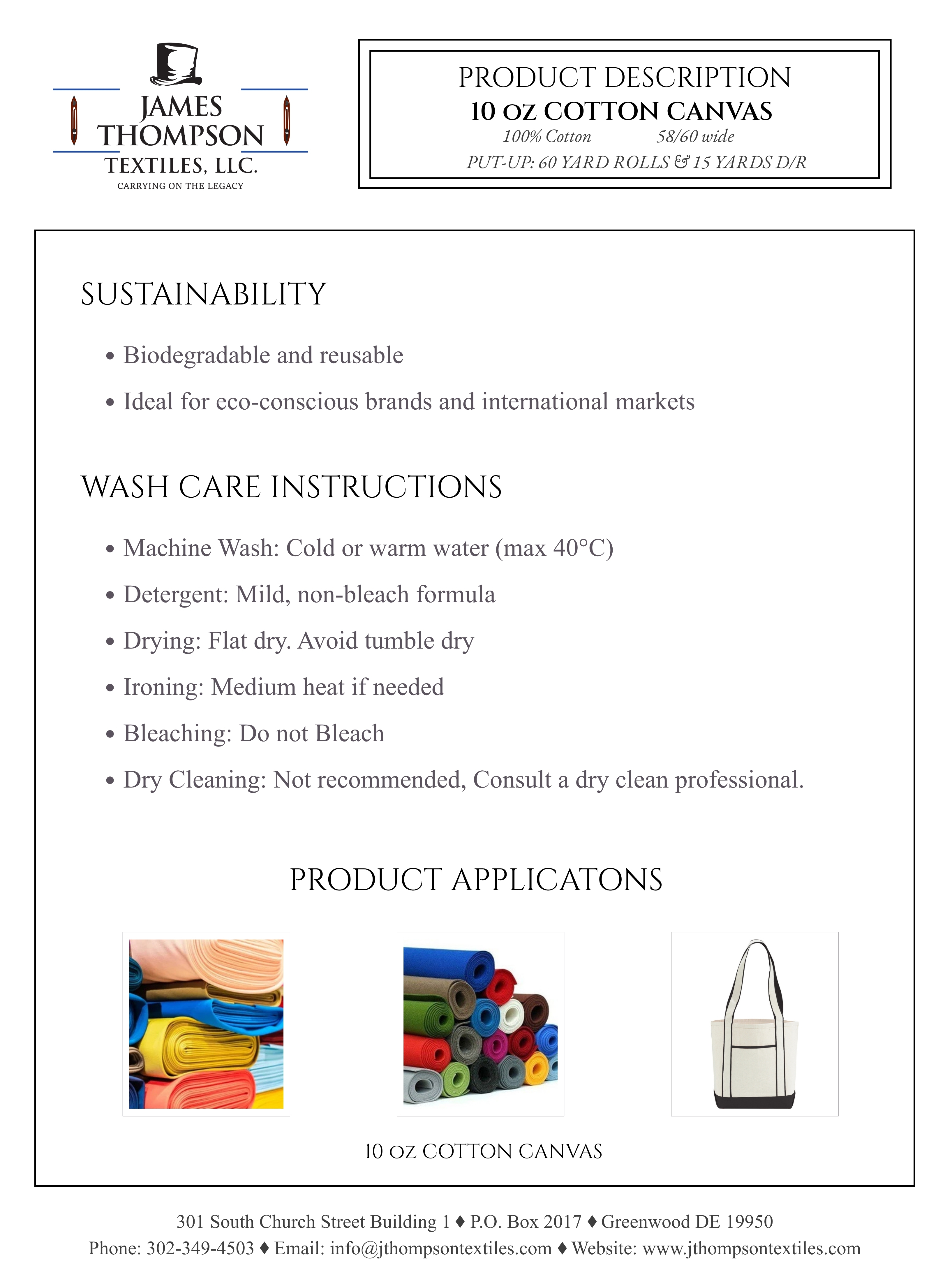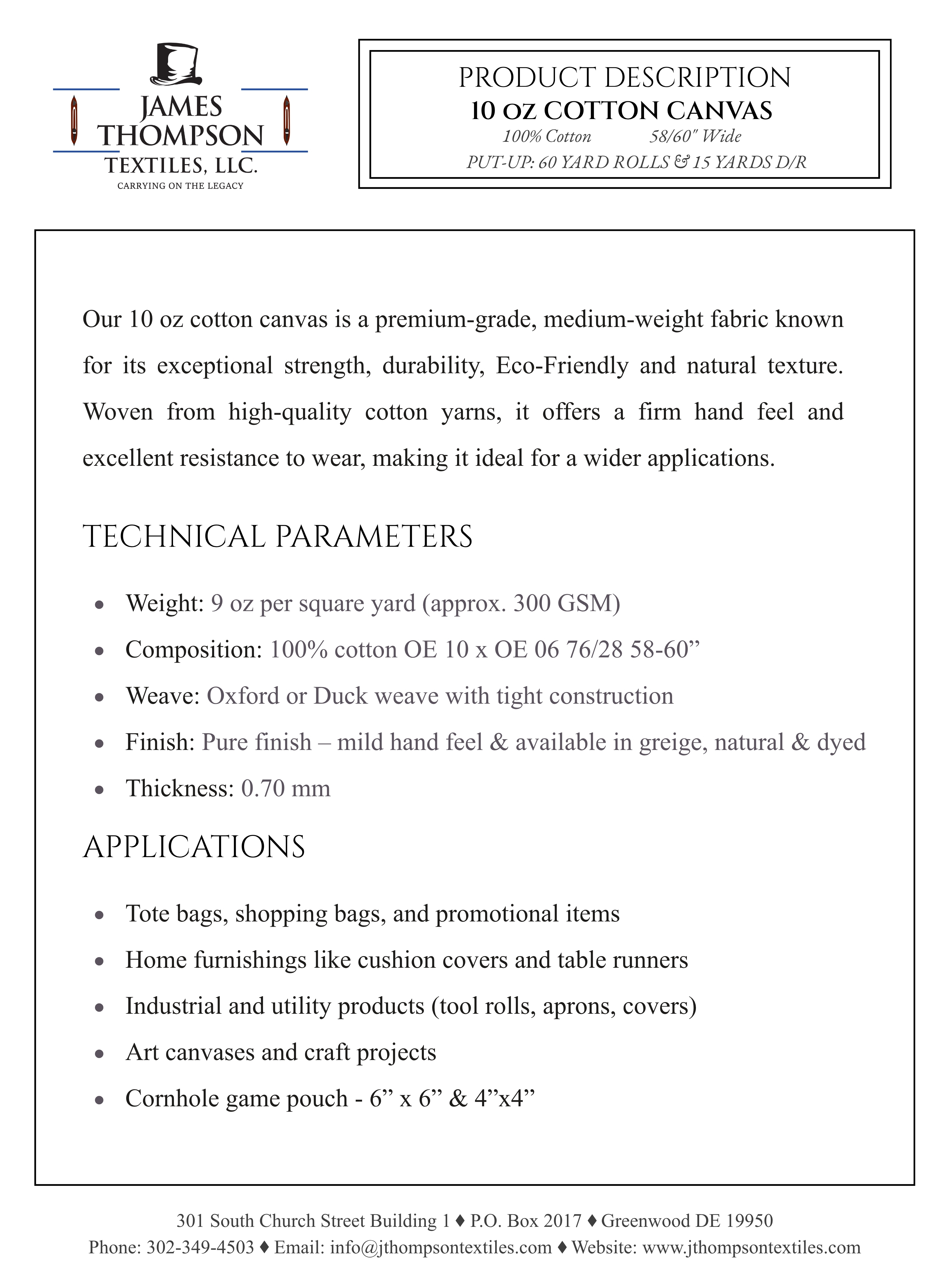 Our 10 oz cotton canvas is a premium-grade, medium-weight fabric known for its exceptional strength, durability, Eco-Friendly and natural texture. Woven from high-quality cotton yarns, it offers a firm hand feel and excellent resistance to wear and tear, making it ideal for a wide range of applications.