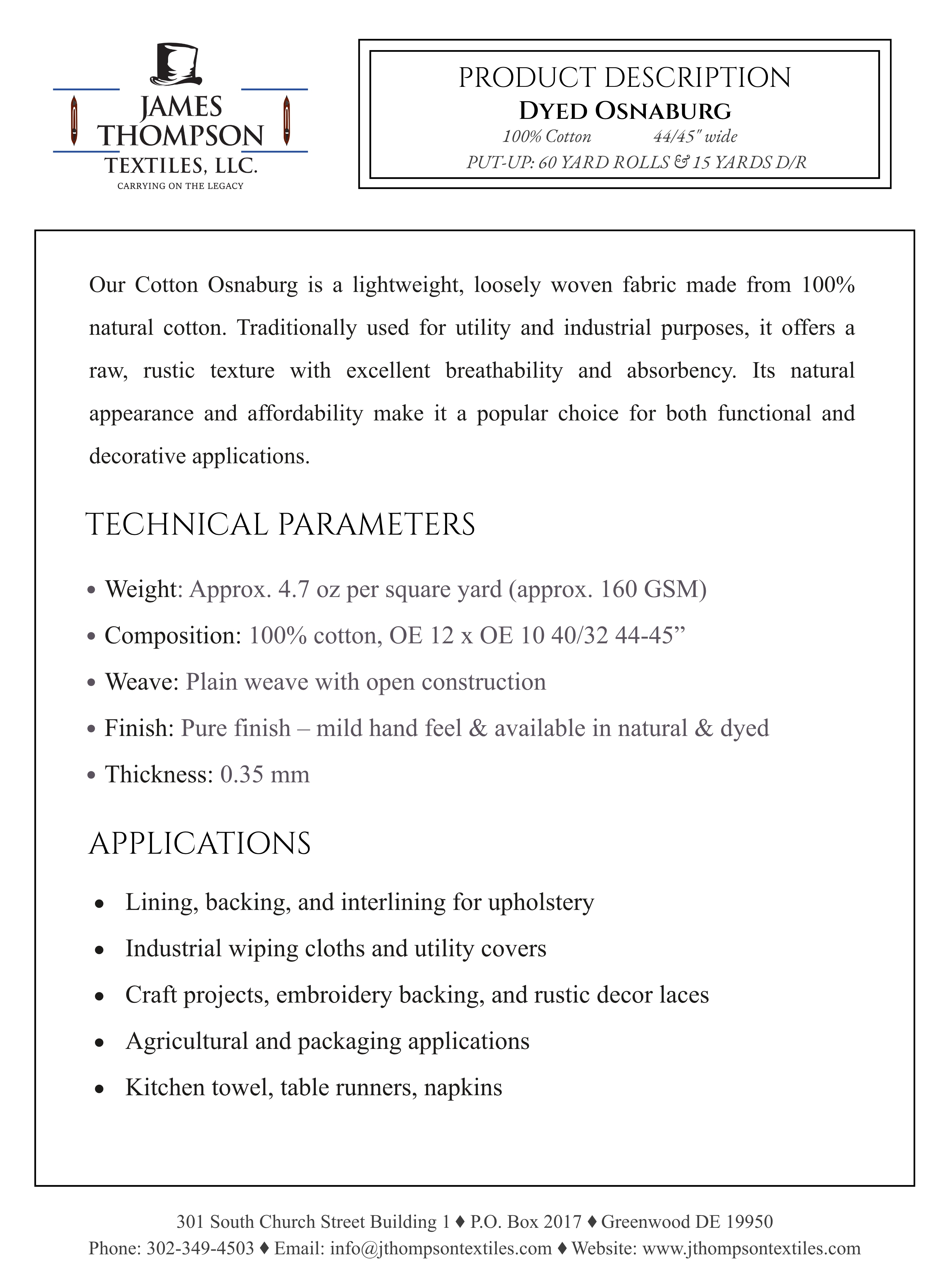 Our Cotton Osnaburg is a lightweight, loosely woven fabric made from 100% natural cotton. Traditionally used for utility and industrial purposes, it offers a raw, rustic texture with excellent breathability and absorbency. Its natural appearance and affordability make it a popular choice for both functional and decorative applications.