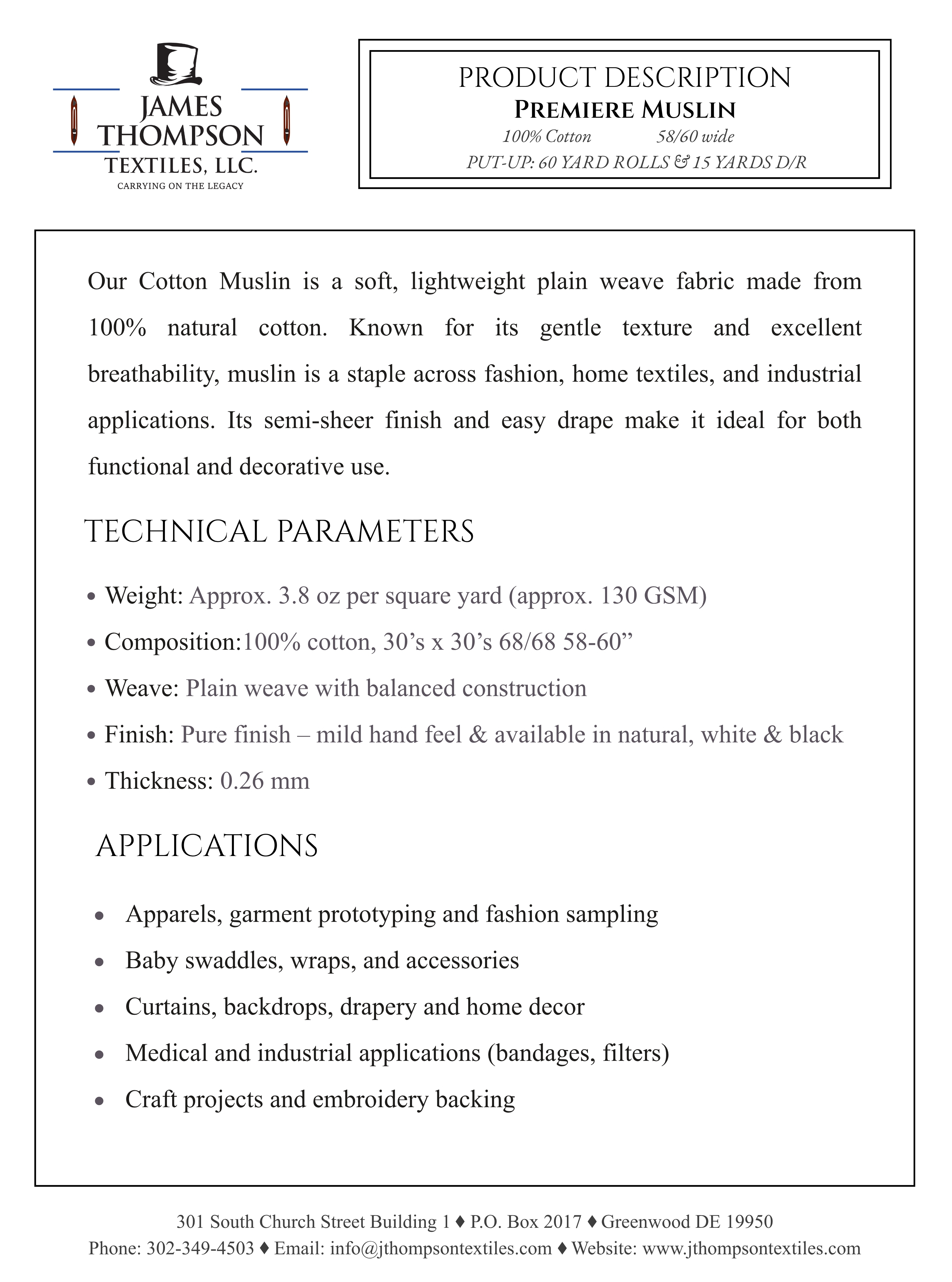 Our Cotton Muslin is a soft, lightweight plain weave fabric made from 100% natural cotton. Known for its gentle texture and excellent breathability, muslin is a staple across fashion, home textiles, and industrial applications. Its semi-sheer finish and easy drape make it ideal for both functional and decorative use.