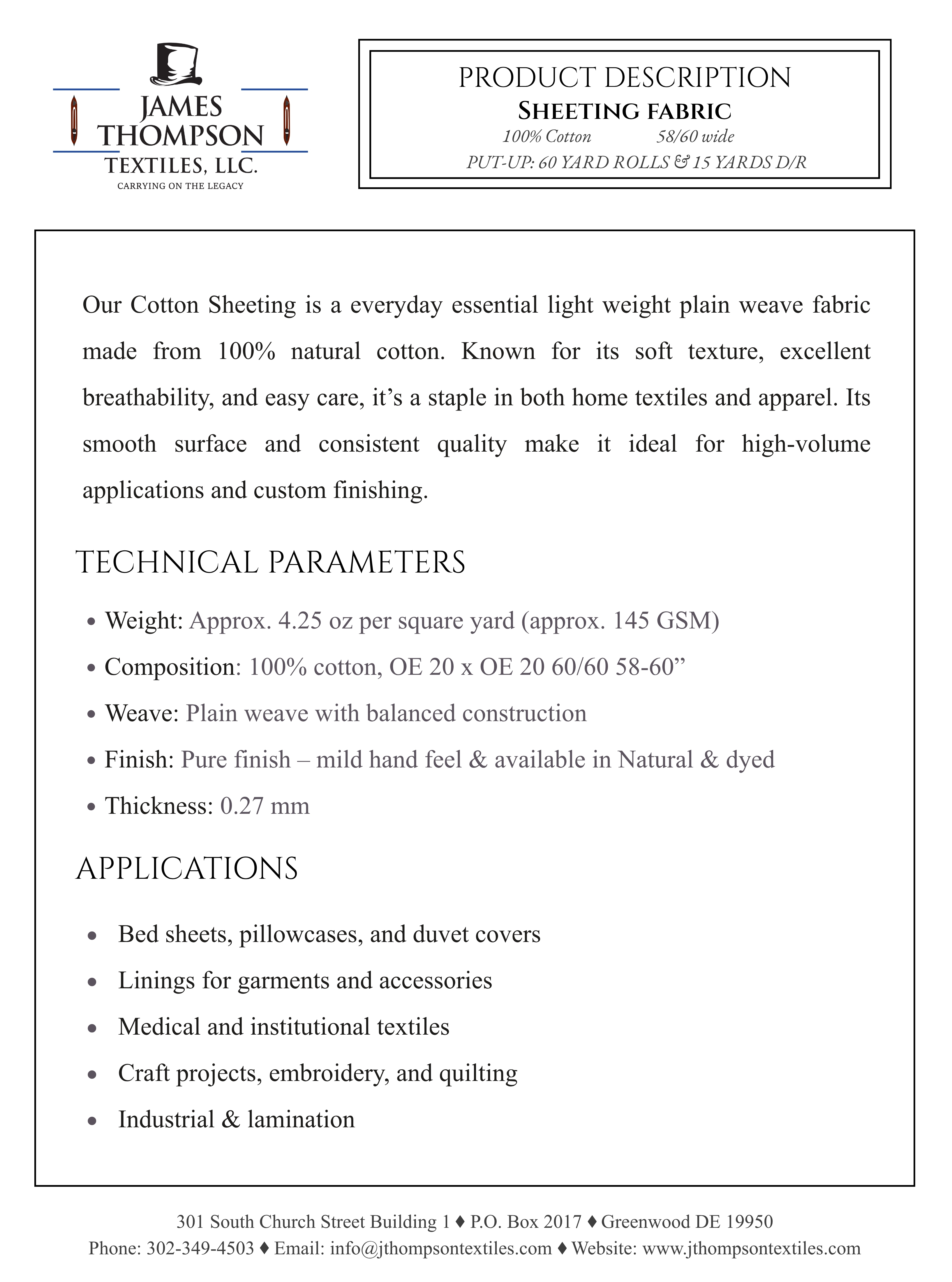 Our Cotton Sheeting is a light weight plain weave fabric made from 100% natural cotton. Known for its soft texture, excellent breathability, and easy care, it’s a staple in both home textiles and apparel. Its smooth surface and consistent quality make it ideal for high-volume applications and custom finishing.