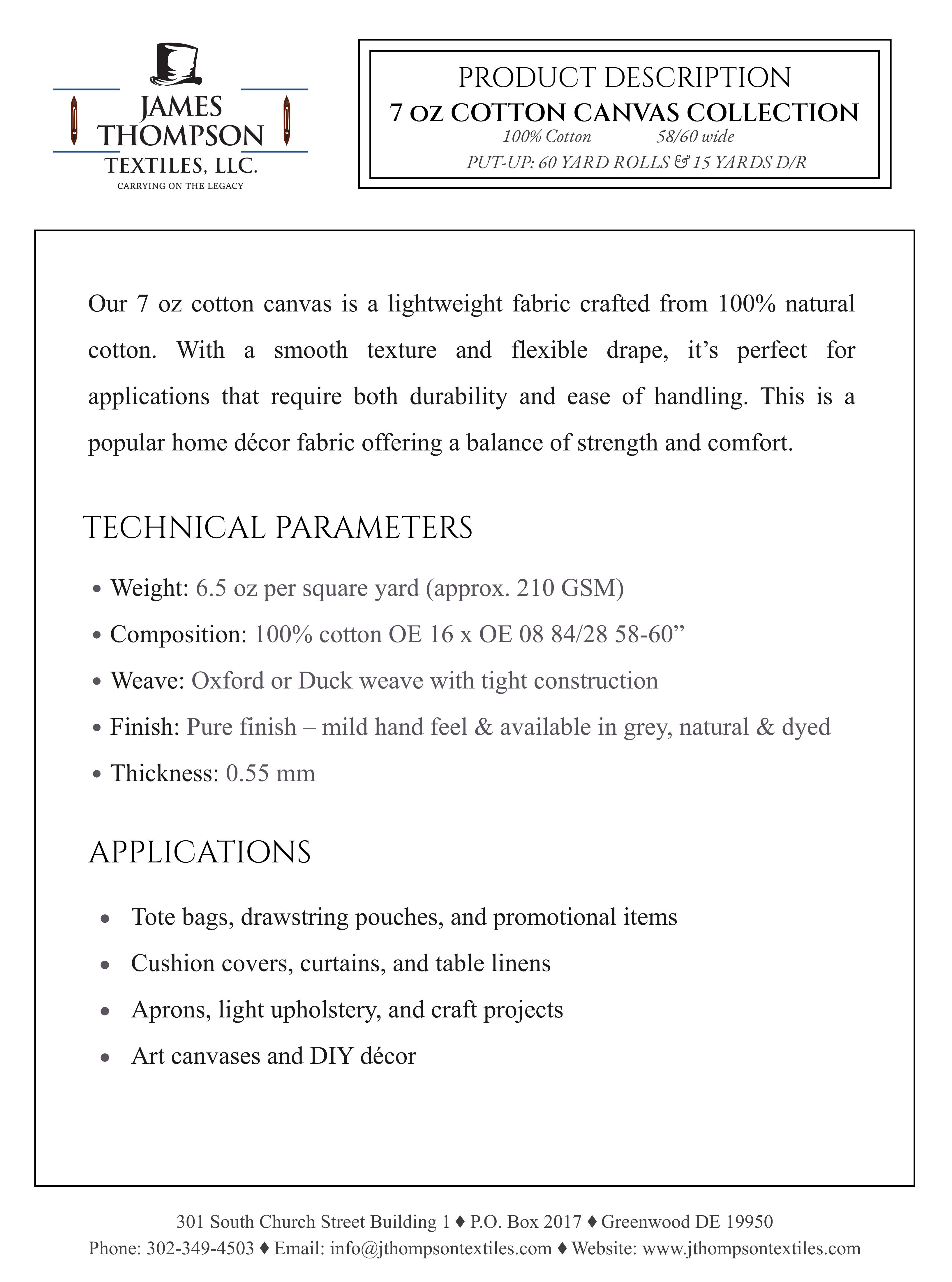 Our 7 oz cotton canvas is a lightweight fabric crafted from 100% natural cotton. With a smooth texture and flexible drape, it’s perfect for applications that require both durability and ease of handling. This is a popular home décor fabric offering a balance of strength and comfort.